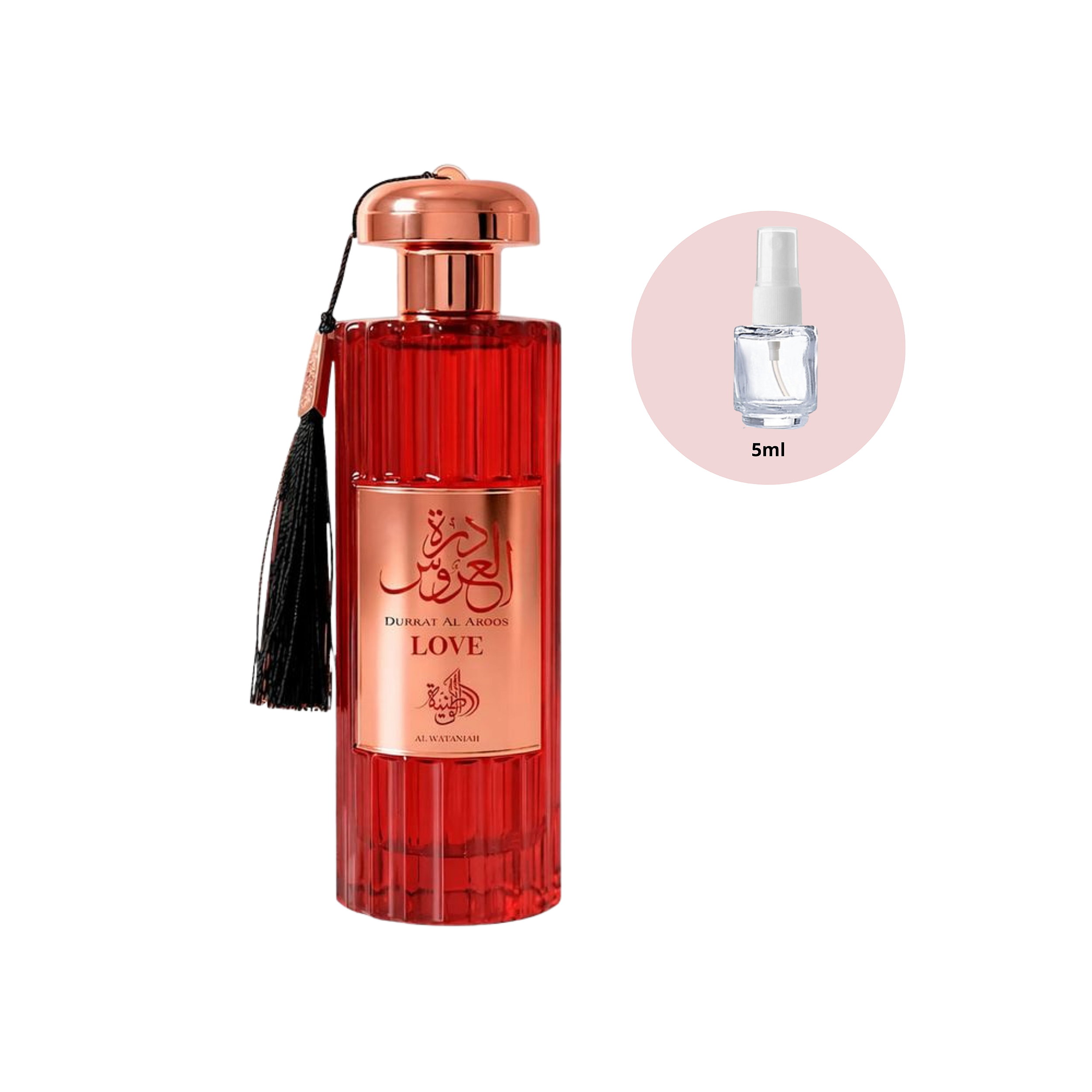 Al Wataniah Durrat Al Aroos Love Eau de Parfum é uma fragrância feminina intensa, sensual e envolvente, ideal para mulheres que apreciam perfumes orientais especiados com assinatura marcante e sofisticada. Sua composição combina acordes quentes e misteriosos na abertura, evolui para um coração adocicado e especiado e finaliza com base amadeirada e confortável, criando um aroma poderoso, elegante e extremamente sedutor. É um perfume de presença notável, perfeito para noites especiais e ocasiões em que se deseja destacar personalidade e charme.Características:Marca: Al WataniahLinha: Durrat Al Aroos LoveCategoria: Perfume FemininoConcentração: Eau de ParfumBenefícios: Aroma intenso, sofisticação oriental, boa projeção e assinatura marcanteModo de Aplicação:Aplicar nas áreas de maior circulação sanguínea como pescoço, pulsos e atrás das orelhas. Reaplicar conforme desejar.Especificações do Produto:Gênero: FemininoConcentração: Eau de ParfumOcasião: Noite, Eventos, Encontros, Inverno e OutonoNome do Produto: Durrat Al Aroos LoveLinha: Al WataniahVersão: Eau de ParfumFamília Olfativa: Oriental EspeciadoNotas de Topo: Almíscar branco, nagarmota ou óleo de cipriolNotas de Coração: Baunilha, açafrão, cardamomoNotas de Fundo: Madeira guaiac, cumarinaBenefícios do Produto:Eficácia: Cria uma fragrância feminina intensa com assinatura oriental especiada envolvente.Durabilidade: Boa fixação com projeção marcante ao longo das horas.Versatilidade: Ideal para noites frias e ocasiões especiais.Design ou Praticidade: Frasco elegante que traduz a proposta luxuosa da fragrância.Al Wataniah Durrat Al Aroos Love Eau de Parfum é a escolha perfeita para quem busca um perfume feminino poderoso, quente e sedutor, com especiarias refinadas, baunilha envolvente e fundo amadeirado confortável. Uma fragrância que deixa rastro e personalidade por onde passa.