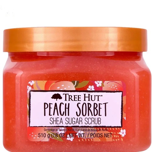 Esfoliante Corporal Peach Sorbet Shea Sugar Scrub da Tree Hut. Ele é um esfoliante corporal à base de açúcar, conhecido por sua fragrância doce e frutada de pêssego.