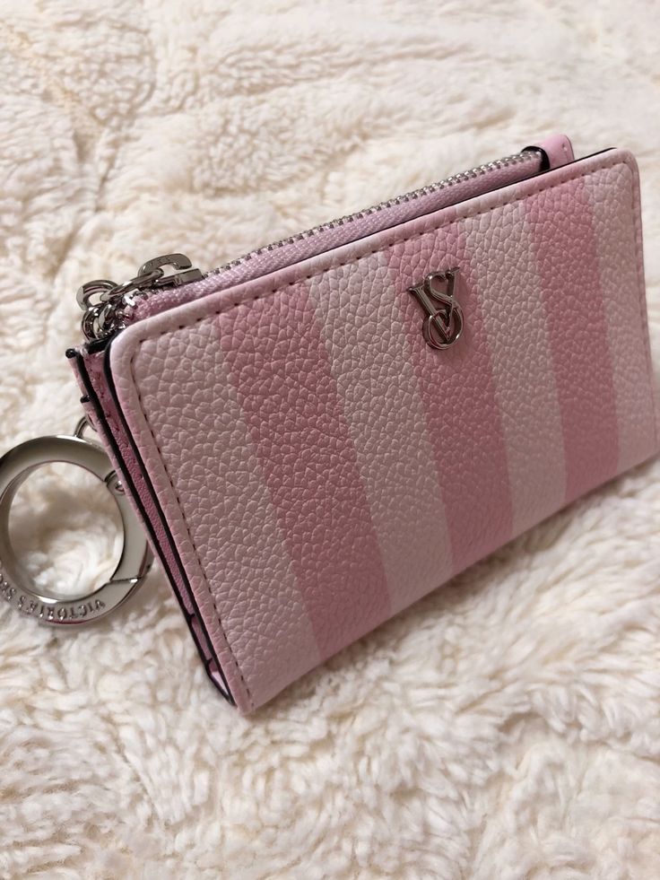 porta-cartões da Victoria's Secret, que também pode ser usado como carteira ou chaveiro. Ele apresenta o logotipo da marca em metal e a estampa listrada em tons de rosa e branco, que é uma característica icônica da marca.
